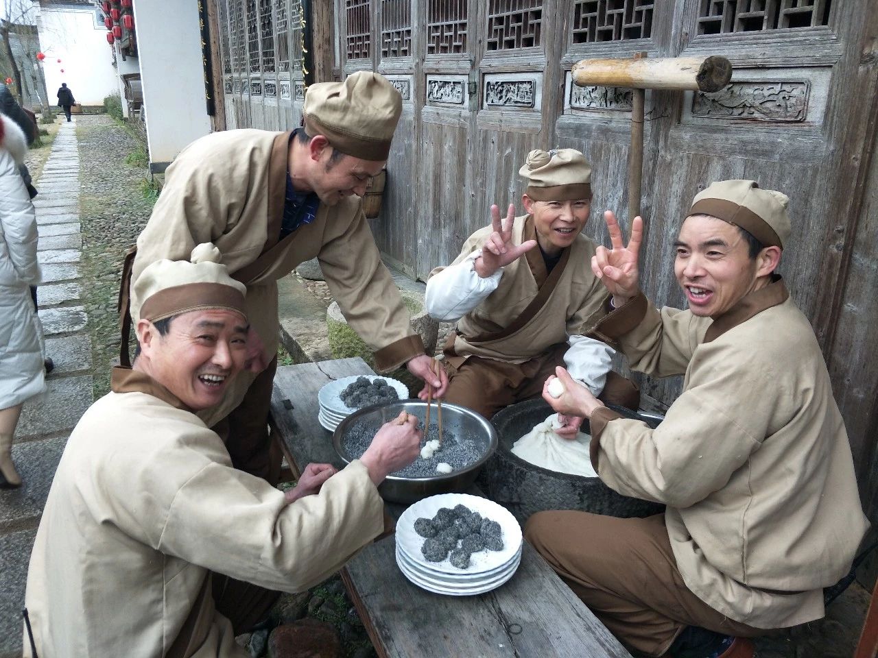 开心的打麻糍师傅们为大家打出软糯的麻糍